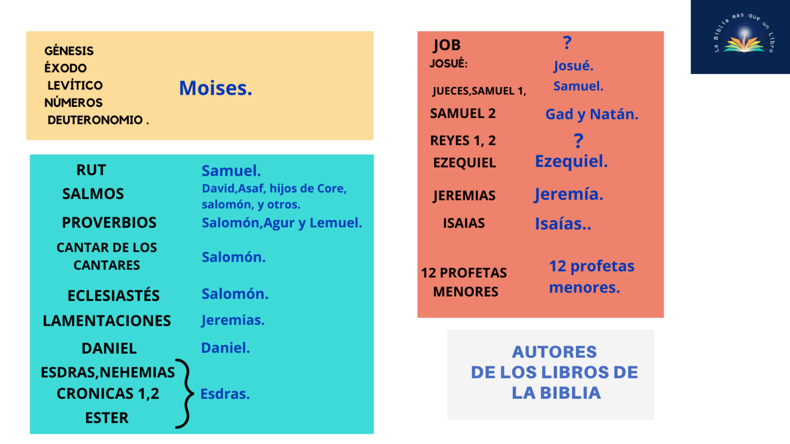 - Revelación: Daniel, Esdras, Nehemías, 1.º y 2.º de Crónicas.